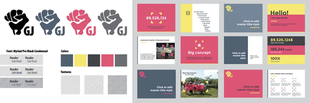 As a team, we discussed ways in which we could create a brand strategy to provide GenderJust with a unified web presence. One of my teammates used InDesign to create logos, a style tile for the website, and a presentation template.